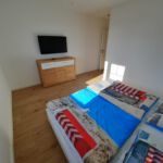 Im EG befindet sich die Küche mit einem großen Esstisch, übergehend in den Wohnbereich mit Kaminofen. Über eine Holztreppe gelangen Sie in das Obergeschoss. Dieses teilt sich in drei Schlafzimmer mit je einem Doppelbett auf. Das Bad ist mit einer großen Dusche sowie eine Sauna ausgestattet. Die große Terrasse schlängelt sich ums Haus und sorgt so für Sonnenstunden von morgens bis abends. Das Haus ist umgeben von viel Grün mit blühenden Sträuchern und Bäumen.